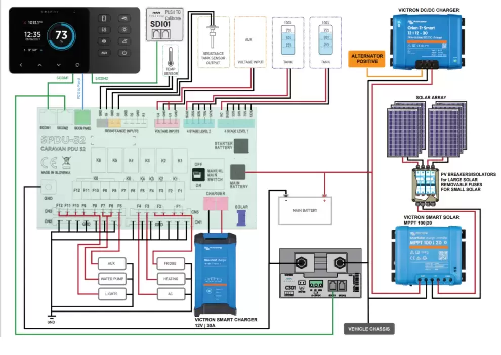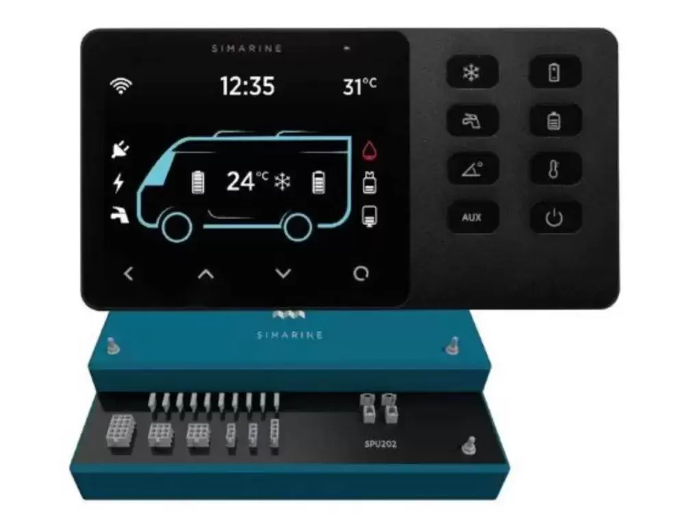 Painel de controle SIMARINE SCC8 + unidade de controle SPDU-52 para autocaravanas e campistas.