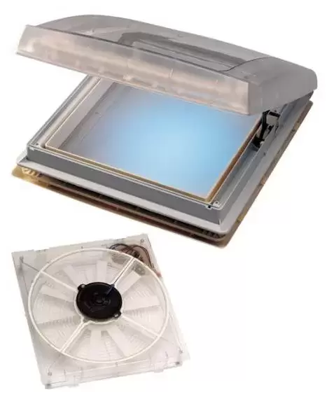 Pode ser colocado em uma abertura de 40 x 40 cm (tamanho padrão da clarabóia) Espessura do teto: 25 a 50 mm. Ventilação permanente Voltagem: 12 V. Com mosquiteiro e persiana opaca.