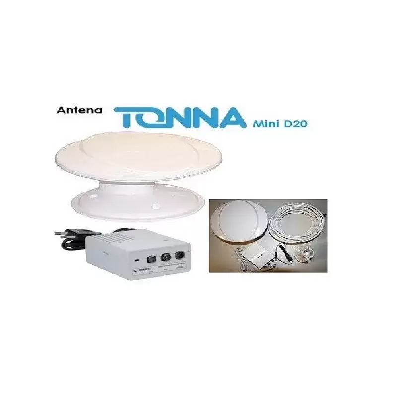 Antena digital omnidirecional HD DTT, marca TONNA, especial para autocaravanas e autocaravanas, é o modelo mais pequeno com as mesmas características de uma antena omnidirecional maior com um potente amplificador de sinal com 40db e uma altura de apenas 12cm, vem com um acessório para também coloque um mastro de antena.
