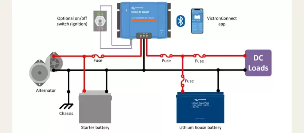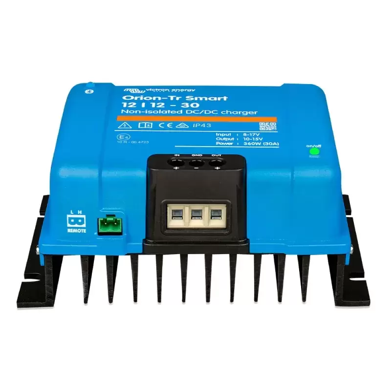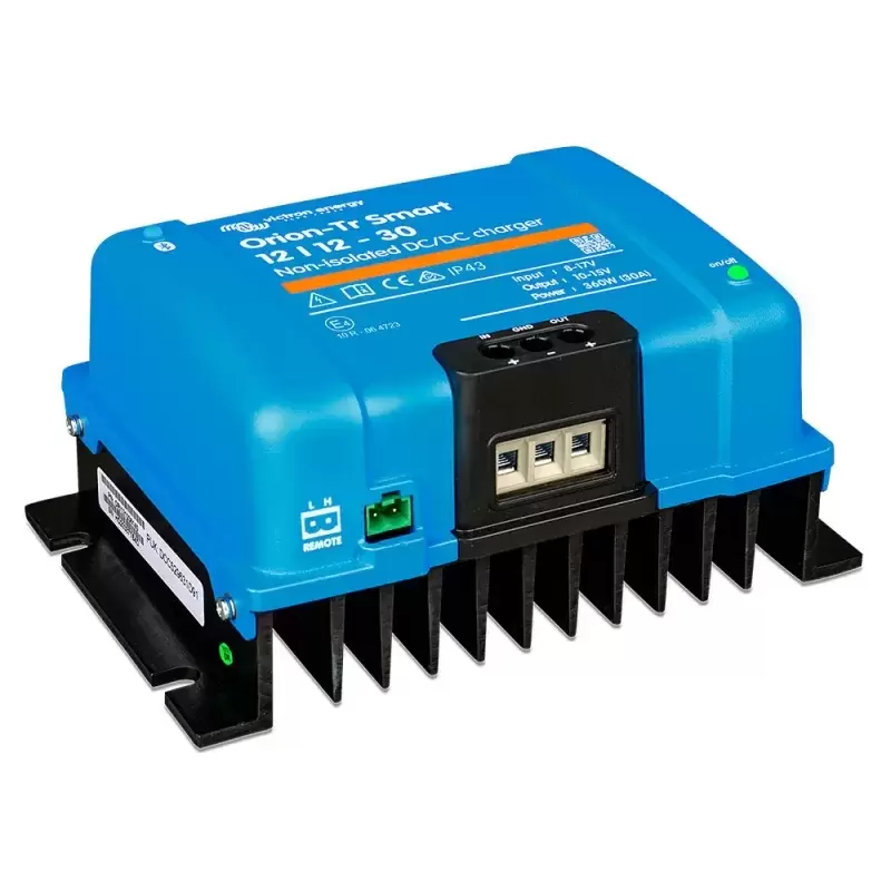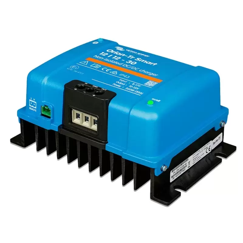 Para uso em sistemas de bateria dupla em veículos ou barcos onde o alternador e a bateria de arranque são usados para carregar a bateria de serviço. A unidade pode ser monitorada e programada via Bluetooth e pode ser controlada remotamente usando um botão liga/desliga remoto. O carregador Orion-Tr Smart pode ser usado em sistemas de 12 ou 24 V e é adequado para baterias de chumbo-ácido e de lítio. Modelos de até 400 W estão disponíveis e um número ilimitado de unidades pode ser conectado em paralelo para aumentar a potência.