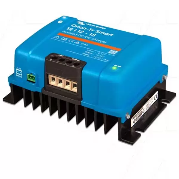 Para uso em sistemas de bateria dupla em veículos ou barcos onde o alternador e a bateria de arranque são usados para carregar a bateria de serviço. A unidade pode ser monitorada e programada via Bluetooth e pode ser controlada remotamente usando um botão liga/desliga remoto. O carregador Orion-Tr Smart pode ser usado em sistemas de 12 V e é adequado para baterias de chumbo-ácido e de lítio. Modelos de até 400 W estão disponíveis e um número ilimitado de unidades pode ser conectado em paralelo para aumentar a potência.