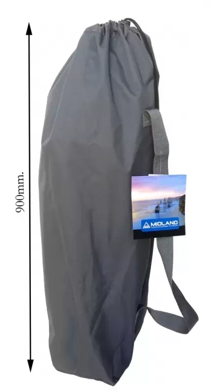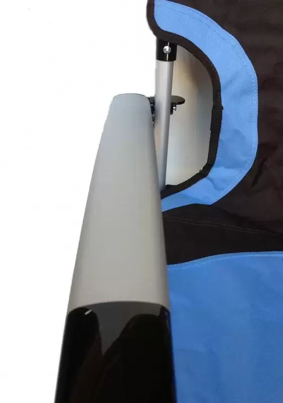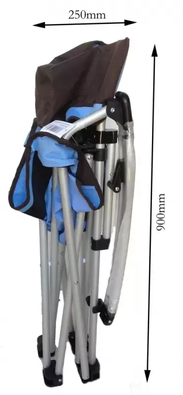 Tecido de poliéster 600D de qualidade (600g/m2). Cor azul/castanho Altura do encosto 65cm. e profundidade do assento 45cm. Com capa resistente para guardar.