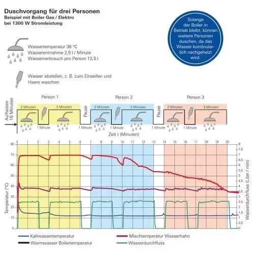 Enquanto a caldeira permanecer em funcionamento, várias pessoas podem tomar banho uma após a outra.