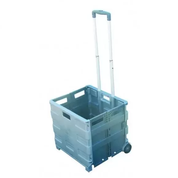 Prático carrinho dobrável, desdobra-se em poucos segundos, permite transportar até 35kg. Fecho de segurança com clip duplo e botão de bloqueio na pega. Fabricado em ABS e alumínio, roda com superfície de borracha antirruído e cabo telescópico.