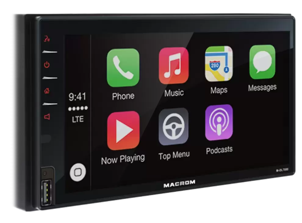 O CarPlay é a maneira mais avançada de conectar um iPhone ao seu sistema de entretenimento doméstico Macrom. Permite acesso a uma variedade de recursos do smartphone, como música, mensagens e navegação. O iPhone pode ser controlado por voz ou através da interface de usuário do nosso produto. O CarPlay vai muito além do que foi feito antes com uma interface de usuário "sem olhos" que usa o assistente de voz da Apple, Siri, acessível com um toque no botão de controle de voz para a maioria das funções.