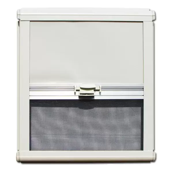 Conjunto de caixilharia com rede mosquiteira e estore que se pode fixar no interior das janelas das caravanas ou autocaravanas que não as possuam, com guias de deslizamento das lonas com ganchos e fechos resistentes.