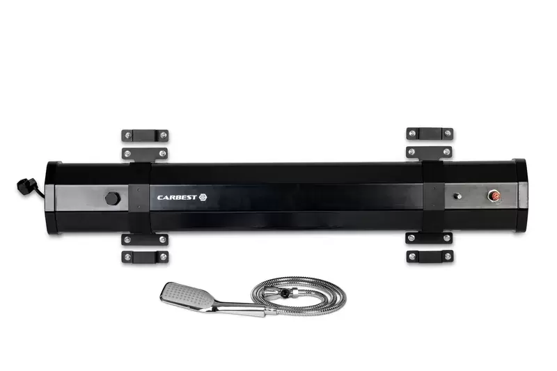 - Este chuveiro externo de alta qualidade, feito de PVC de grau alimentício, oferece capacidade para 20 litros e garante um banho refrescante ao ar livre. Pode ser usado com compressor ou bomba de bicicleta e pode ser enchido com uma mangueira de jardim comum. O elegante chuveiro cromado e a mangueira de 1,5 metro oferecem conforto ideal. O suporte cônico com almofada adesiva permite uma fixação segura. Com o kit de montagem universal incluso, o chuveiro pode ser instalado em praticamente qualquer rack de teto, ideal para camping e viagens. Possui válvula de liberação rápida para fácil operação. Dimensões: 113 x 18 x 14,5 cm, incluindo o kit de montagem universal para rack de teto.