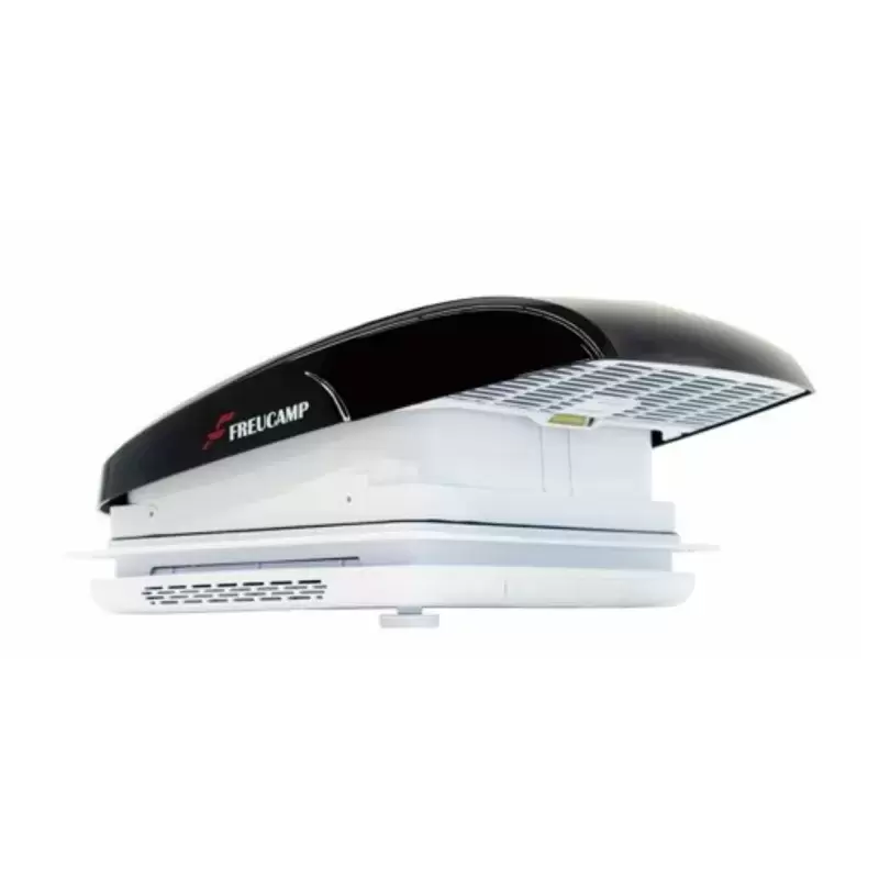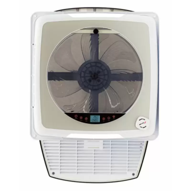 Clarabóia com ventilador tipo Maxxfan com tampa externa escurecida em preto, caravana, autocaravana e autocaravana.