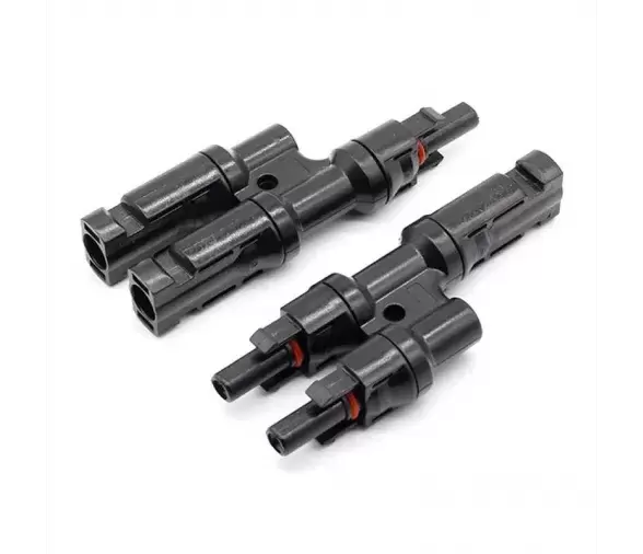Conector para passar de 2 painéis solares para uma saída positiva + e uma saída negativa -