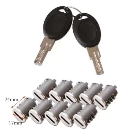 Conjunto de dez cilindros mais duas chaves para substituir e unificar todas as fechaduras de baús e portas de garagem com uma única chave.
