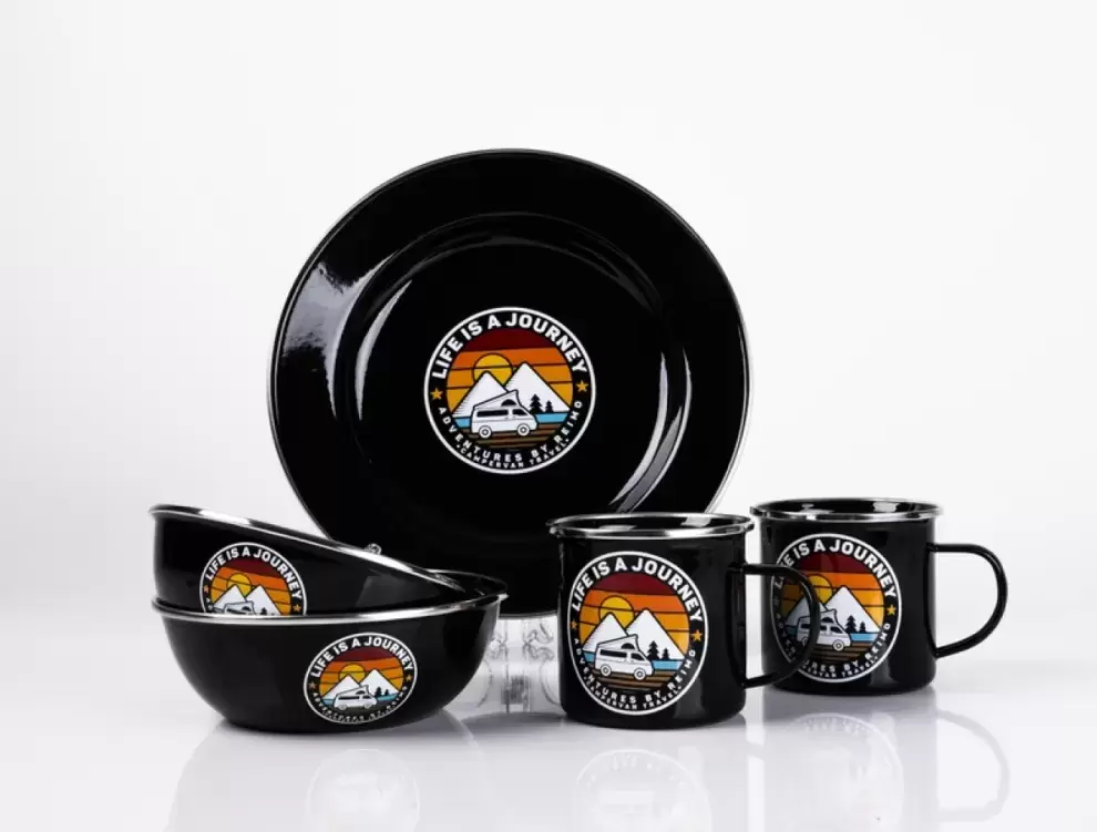 Conjunto de louça esmaltado com 6 peças para 2 pessoas, LIFE IS A JOURNEY.