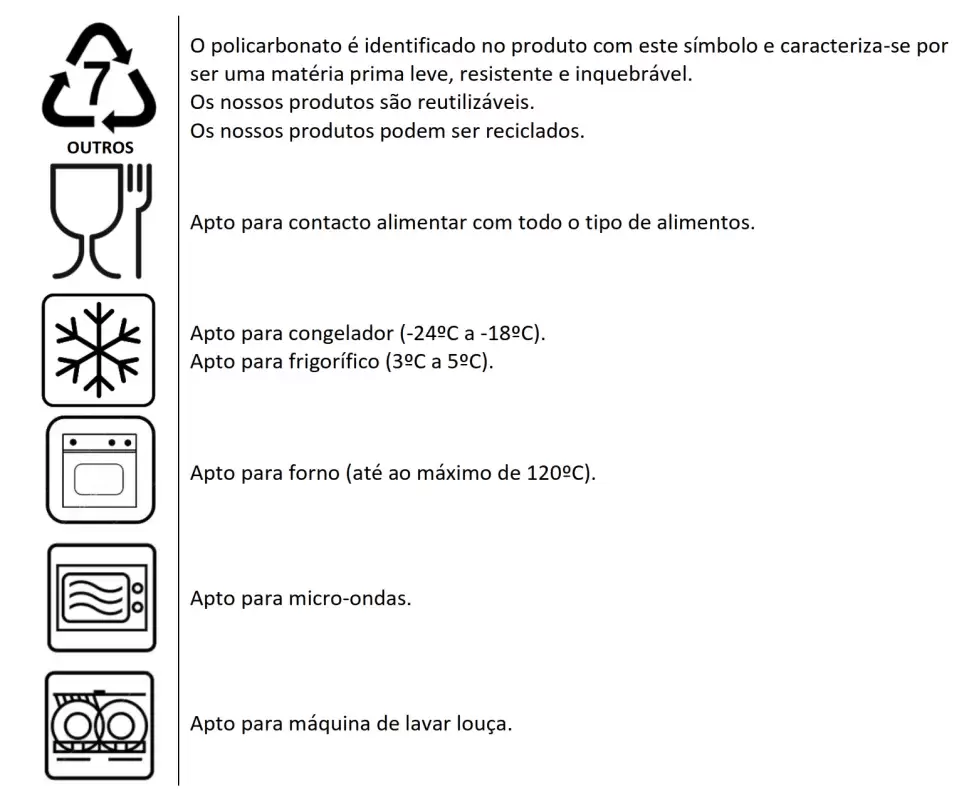 Adequado para congelador e frigorífico, para forno (até 120ºC), para máquina de lavar loiça e micro-ondas.