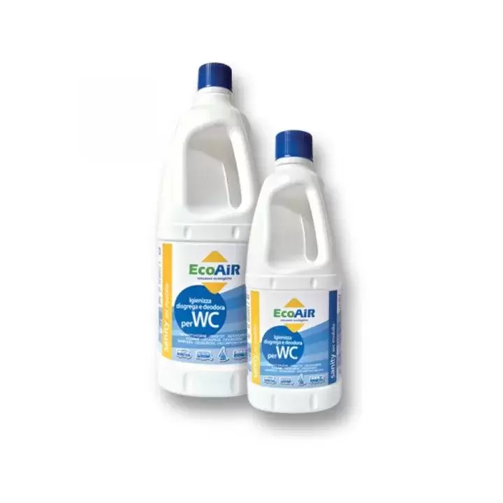 Líquido ecológico para a higienização das águas residuais das sanitas químicas das autocaravanas, caravanas, barcos, autocarros, aviões e todas as instalações sanitárias não ligadas diretamente à rede de esgotos.