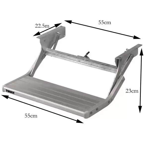 Degrau de entrada THULE feito de alumínio e aço retrátil operado manualmente.