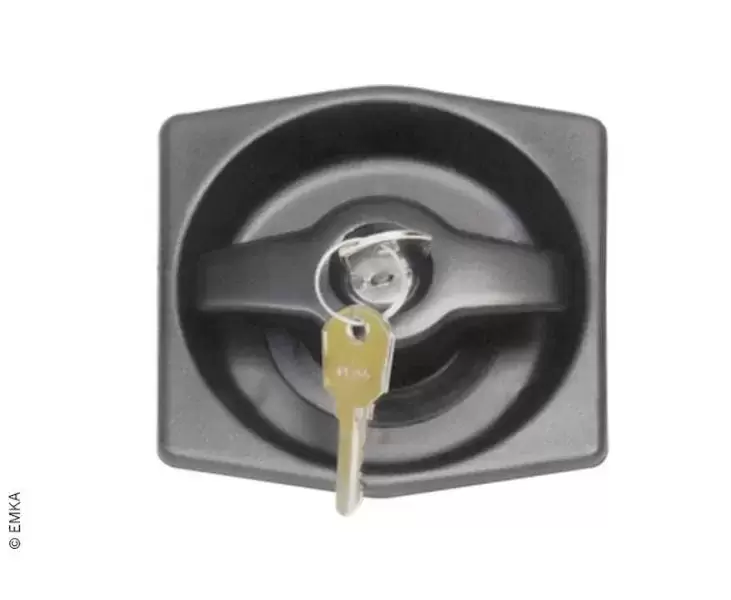 Puxador exterior em poliamida preta com 2 chaves, bloqueável em fechadura GX.
