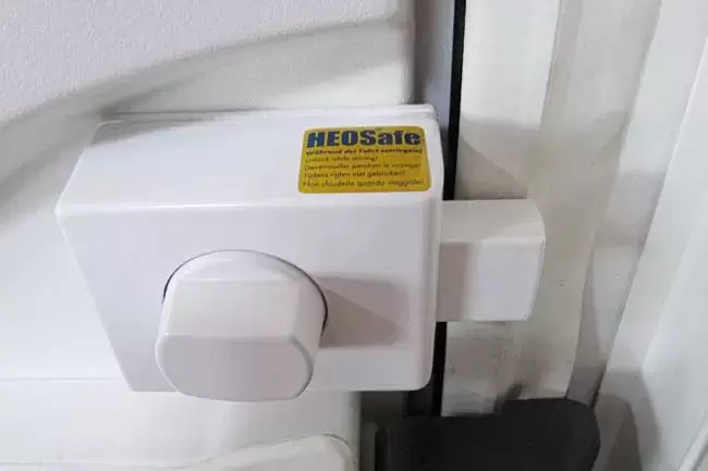 Fechadura adicional HEOSafe® especialmente construída para escotilhas exteriores, portas de garagem, portas exteriores não só para autocaravanas e caravanas, mas também para mercados móveis e food trucks