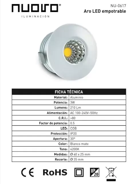 Holofote LED COB redondo branco de 12 V para instalação embutida em caravanas, motorhomes e campers.
