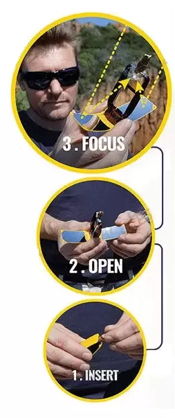 O isqueiro solar SUNCASE GEAR abre as asas e concentra os raios solares num ponto focal para acender em 3 segundos: madeira, papel pardo, tabaco, incenso (...).