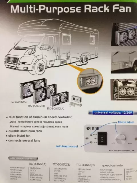 Máxima qualidade para resfriar o fundo da sua geladeira, com ventiladores de 14 cm. Funcionamento silencioso, montado sobre chassis de alumínio, com suportes de alumínio para múltiplas posições de ancoragem, possui sensor de temperatura para funcionamento automático, graças ao qual a velocidade de funcionamento aumenta ao mesmo tempo que a temperatura, possibilidade de funcionamento manual, com ventilador regulador de velocidade, painel de controle em alumínio que pode ser instalado tanto na superfície quanto embutido.