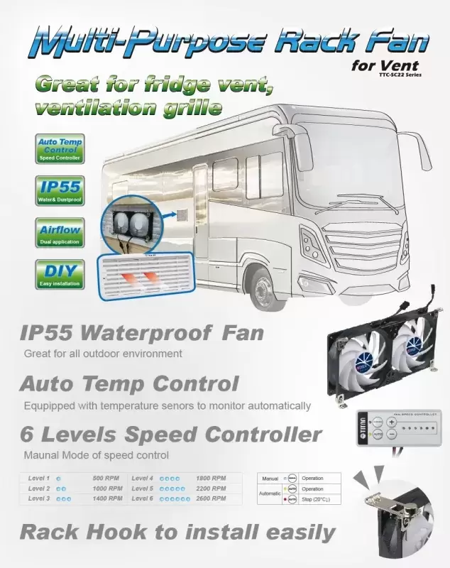 Kit dois ventiladores frigorífico TITAN de 12cm com retificador integrado para caravanas, autocaravanas e autocaravanas. - Ref. TTC-SC22(B)+