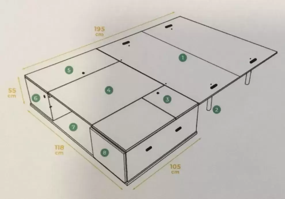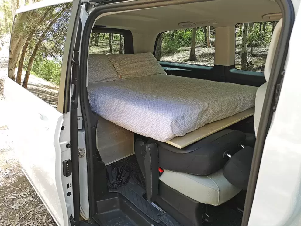 Apenas a terceira fila de bancos teria de ser retirada do veículo, uma vez rebatida a segunda fila de bancos, as tábuas da cama assentam nas costas dos mesmos bancos, inclui também pernas de alumínio caso pretenda reforçar esta base de madeira que se apoia nos encostos dos bancos.