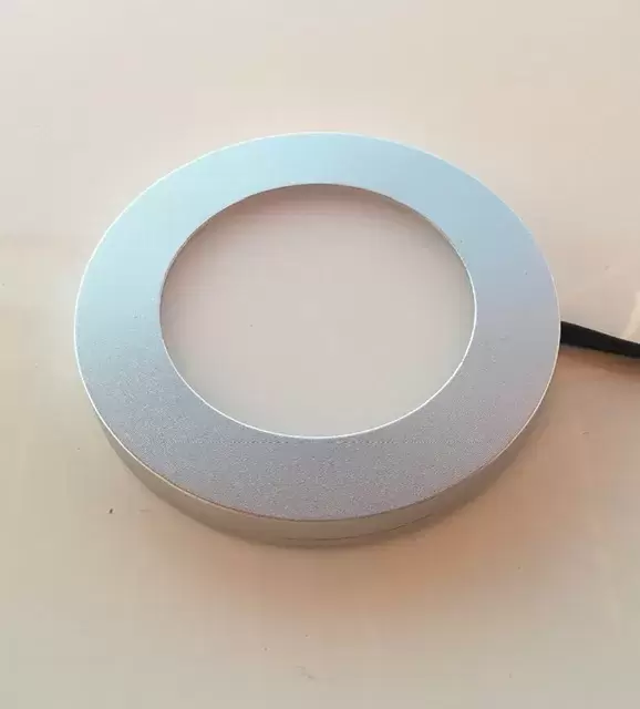4 Luz led 2,7w 12v Luz 6000K medindo 7,1cm na parte externa e 8mm de altura para instalação de superfície e cabo de 2 metros.