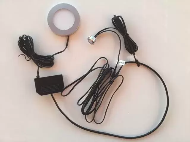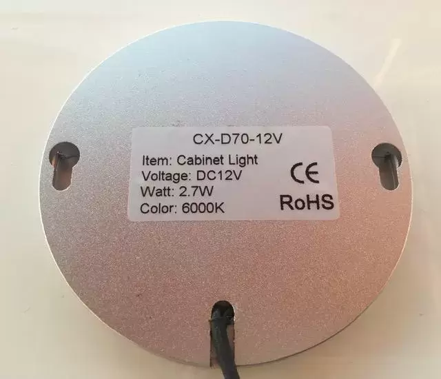 1 Luz led 2,7w 12v Luz 6000K medindo 7,1cm na parte externa e 8mm de altura para instalação na superfície e cabo de 2 metros.