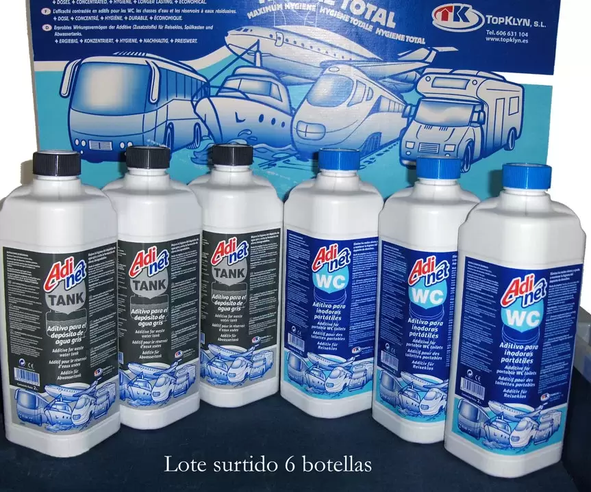 Lote sortido composto por 3 frascos de 2 L. de produto para a sanita e 3 frascos de 2 L. de produto para o depósito de água cinzenta.