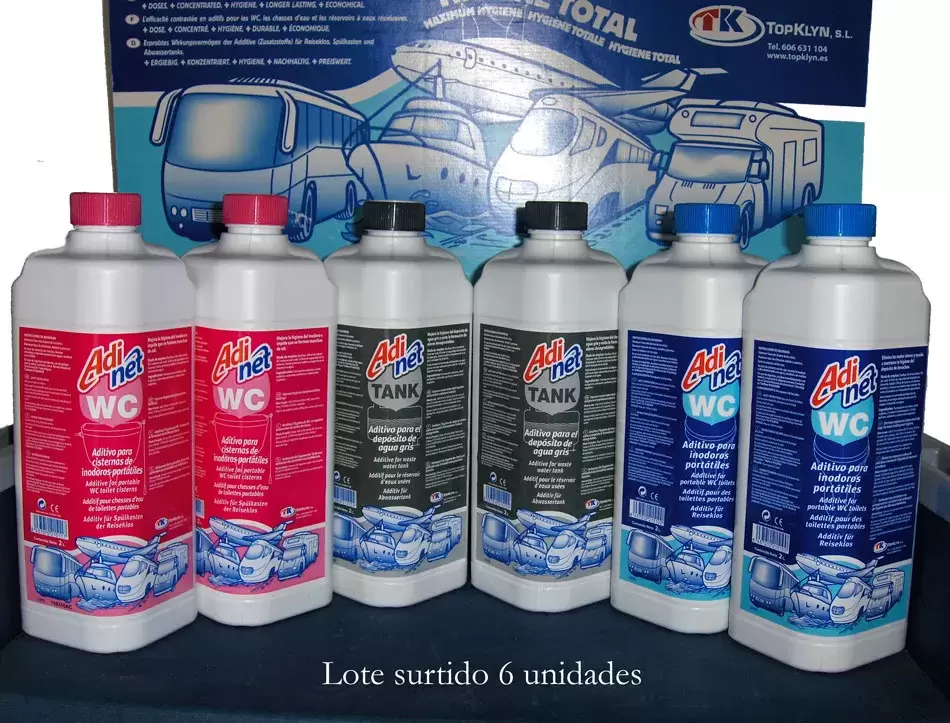 Lote sortido Adinet composto por 2 garrafas de cisterna de 2L, 2 garrafas de banheiro cw de 2L e 2 garrafas de tanque de 2L.
