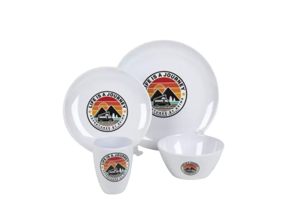 Louça em melamina "LIFE IS A JOURNEY" - para 4 pessoas, caravana, autocaravana, autocaravana e 4x4 terrestre.