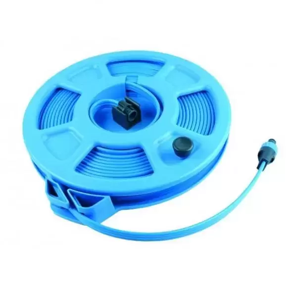 Mangueira plana com suporte de três tubos flexíveis, pode ser utilizada mesmo totalmente enrolada. o encaixe <> protege-o de salpicos, permite-lhe trocar os acessórios vassoura de lavagem, duche, depósito de sabão, lança, etc. sem ter que contar a água. alça removível para parafusar.