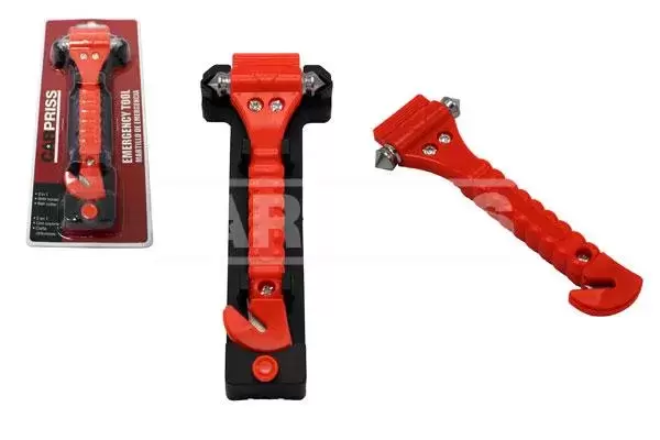 Martelo com ponta especial que quebra vidros e lâmina que corta correias, indispensável em caso de emergência.