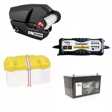 -O motor é fornecido com os dois motores para as rodas, todos os acessórios para a sua instalação, a unidade de controle que gerencia todo o sistema, uma bateria AGM, uma caixa para armazenar a bateria, um carregador de bateria inteligente, um controle remoto e um seccionador de todo o sistema com caixa para instalar no painel sanduíche da caravana.