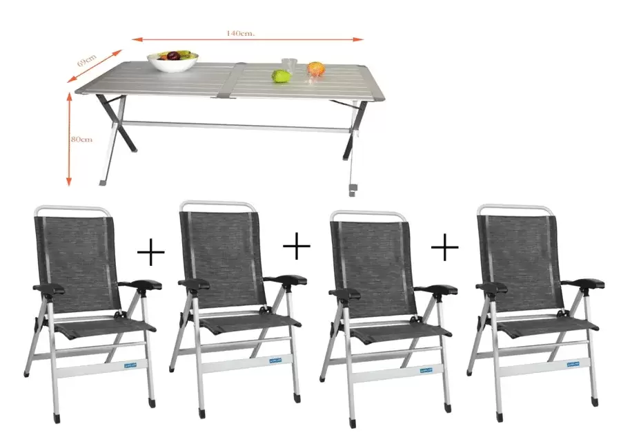 Conjunto de mesa removível de alumínio (muito compacta depois de desmontada e dobrada) mais quatro cadeiras de encosto alto com estrutura de alumínio.