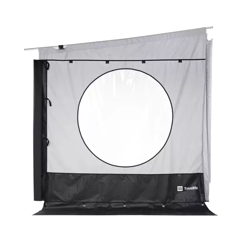 Complete o seu toldo box Thule, Fiamma ou Dometic com o painel lateral Scala universal L Graças ao tecido de poliéster de dupla camada, o painel lateral dura muito mais tempo. Graças às janelas redondas, você ainda pode desfrutar do ambiente protegido das diversas intempéries.