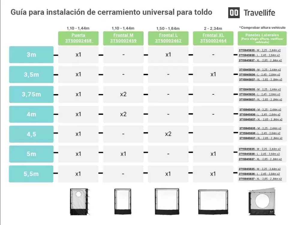 ATENÇÃO! Se tiver alguma dúvida, contacte-nos pelo WhatsApp (+34642834030) com a medida do toldo e a altura do solo até ao revestimento do toldo e indicaremos as referências que necessita.