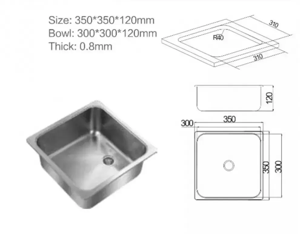 Pia quadrada de aço inoxidável 350x350 para caravanas, autocaravanas e autocaravanas.