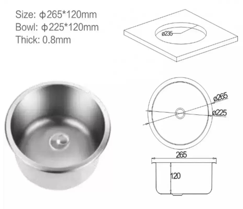 Pia redonda de aço inoxidável 265x265 para caravanas, autocaravanas e autocaravanas. - Ref. GR-577B