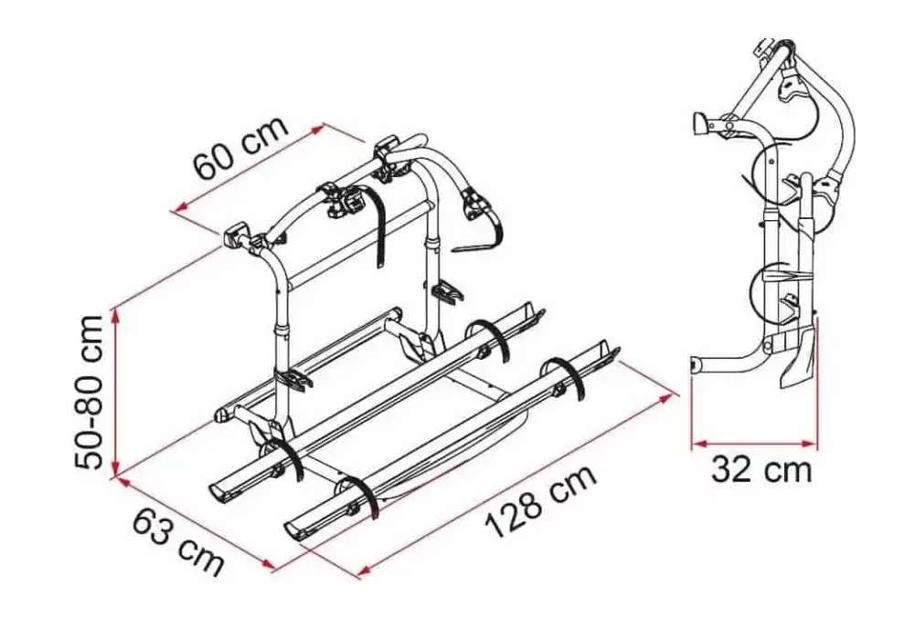 Completamente completo com todos os acessórios para 2 bicicletas, carga máxima de 60 quilos. Pode ser expandido para até 4 bicicletas adicionando braços e trilhos adicionais.