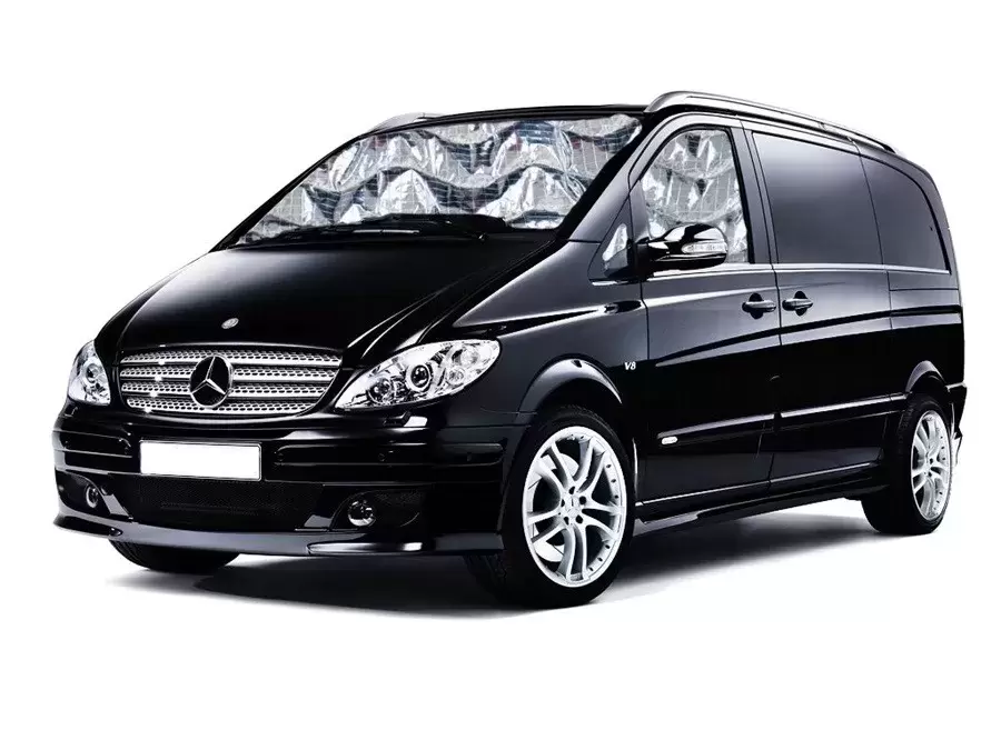 Protetor térmico para Mercedes Viano, protege tanto do calor como do frio, composto por uma peça para o vidro frontal, duas para os vidros laterais e os dois pequenos triângulos na parte inferior do vidro.