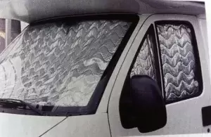 Estores térmicos para autocaravanas com cabeçote Iveco Daily de 2000 a 2006, o kit contém protetores para os dois vidros e para o pára-brisas, bolsa de transporte e ventosas.