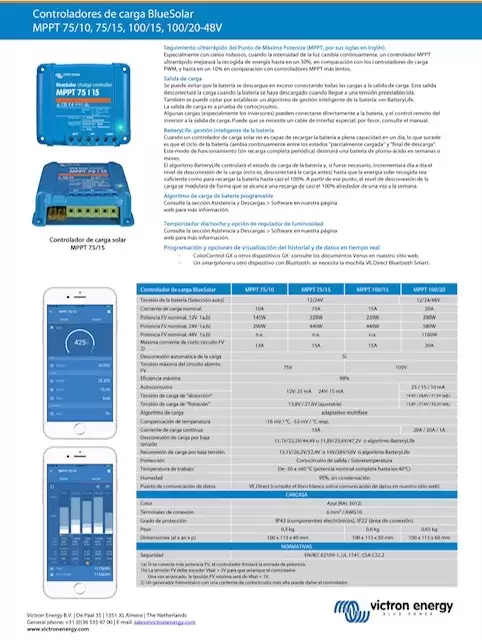 Regulador solar Victron Energy MPPT 100/15 BlueSolar para autocaravanas e autocaravanas. - Ref. SCC010015200R
