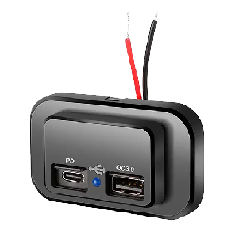 Soquete USB Quick Chargers COM controlador de protocolo de carga rápida e 1 USB-C MINI de montagem em superfície.