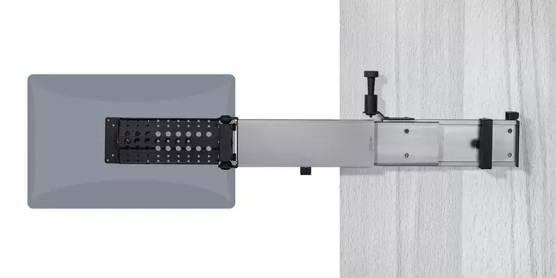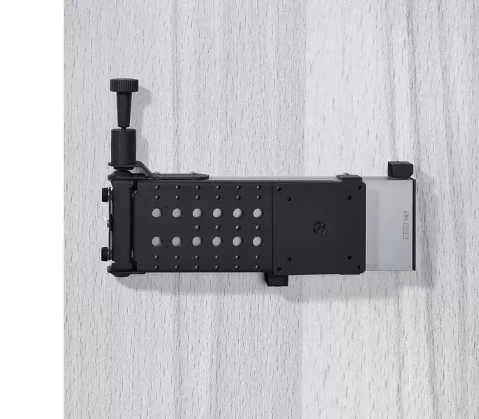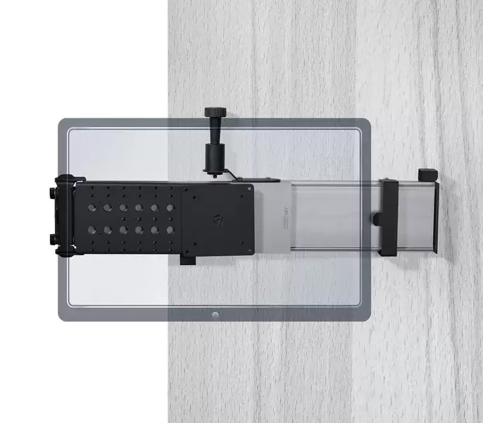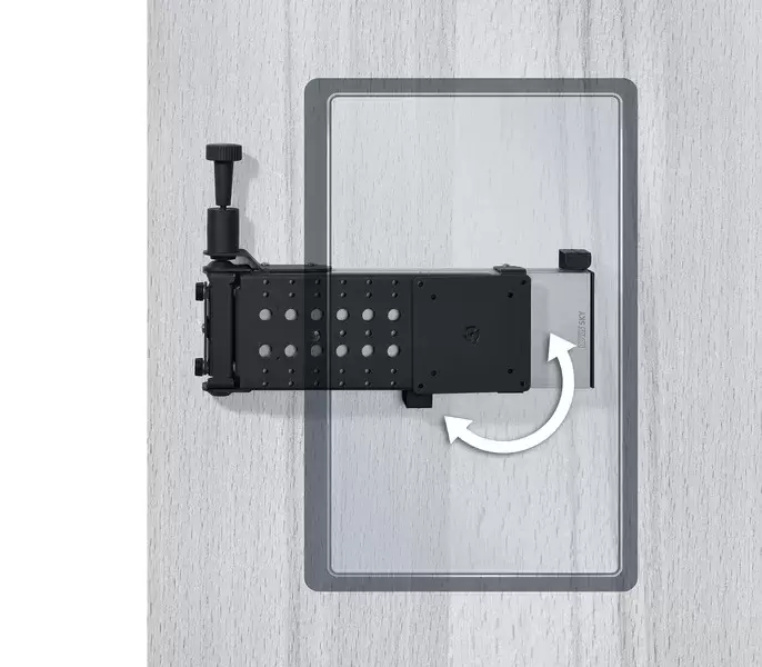 Suporte de parede TFT SKY 20W (VESA 75+100). Extensão com alavanca de travamento para proteger a tela durante a condução. Inclui guia de cabo. Dependendo da situação de instalação, a tela pode ser opcionalmente girada 90° para obter uma profundidade de instalação menor. A tela pode ser girada até 180° quando estendida.