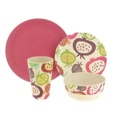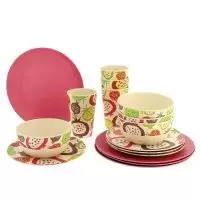 É composto por 4 pratos pequenos (20 cm), 4 pratos grandes (25,5 cm), 4 tigelas (14 cm) e 4 copos (40 cl).