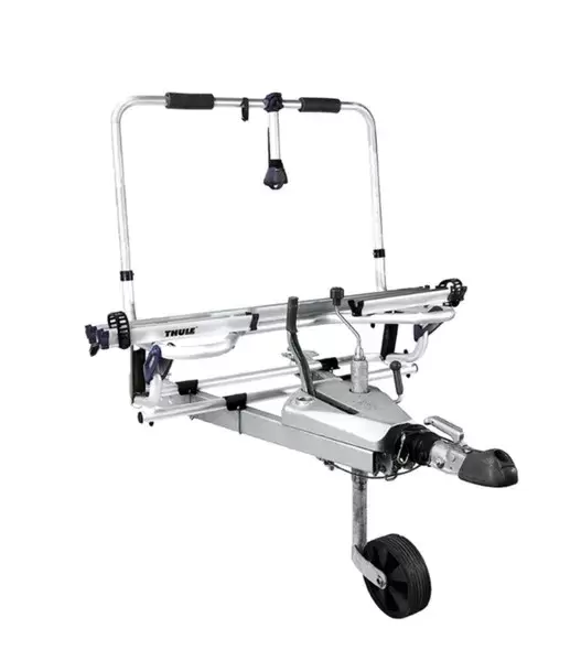 Suporte para bicicleta lança caravana da marca Thule para duas bicicletas expansível para três feito de alumínio, dobrável sem desmontar as bicicletas para acessar o baú frontal.