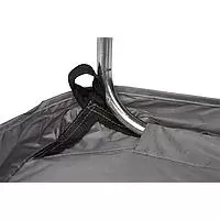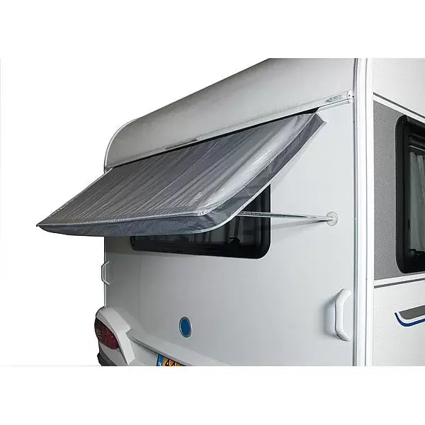 Este toldo para janela de caravana pode ser fixado à calha da caravana com uma corda e tem ventosas na estrutura de aço galvanizado para o fixar à parede da caravana.