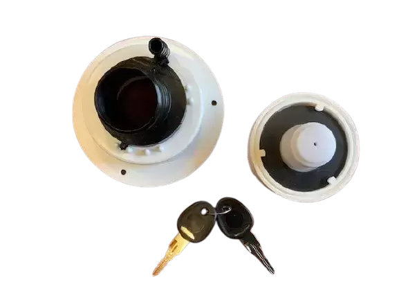 Tomada de água exterior com tampão branco para caravanas, autocaravanas e autocaravanas.
