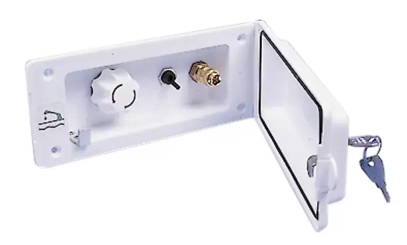 Tomada de duche exterior REICH branco água quente e fria com fechadura 215x95 mm para caravanas, autocaravanas e autocaravanas. - Ref. 63220