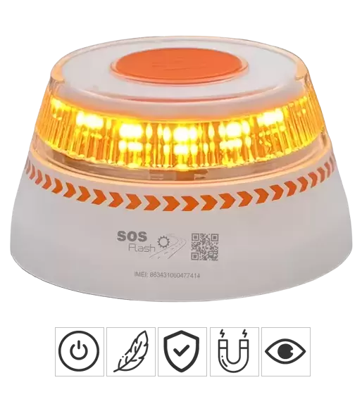 Farol geolocalizado / Botão de energia / Visível 360º e 1 km / Fácil de guardar / Resistente à chuva / Base magnética / Caixa anti-choque / eSIM anónimo / Autonomia até 6 horas / Cartão SIM incluído / Dados incluídos até 2038 / 3 Pilhas alcalinas AA 1,5 V Tipo LR6